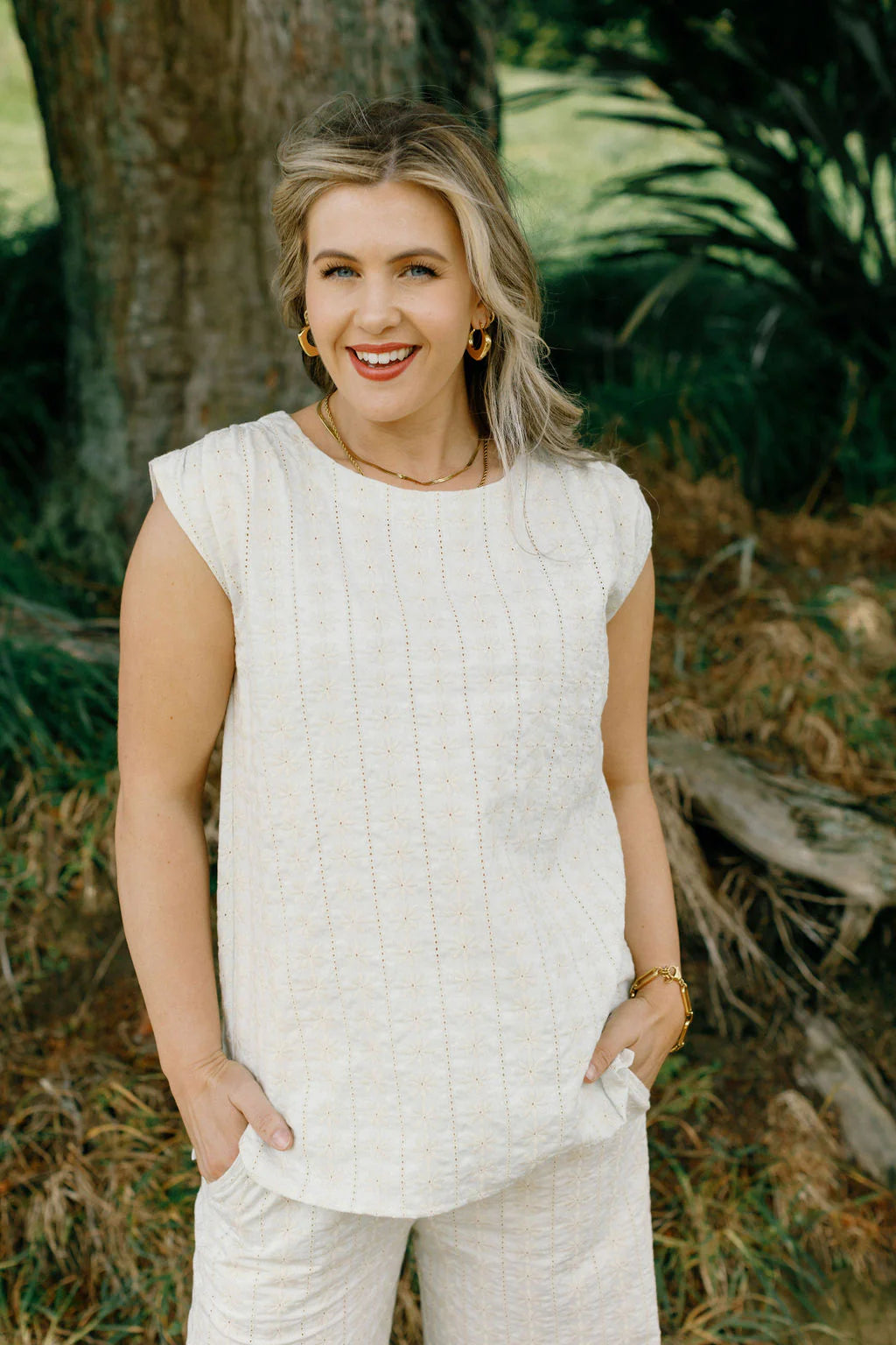 The Daisy Top is a fresh and feminine piece crafted in a fresh Meadow coloured Cotton fabric with delicate Cream embroidered Daisies.